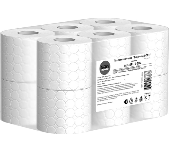 Туалетная бумага Sanpremo SOFTI 2 слоя 9,5х13 см, 56м, 12 рулонов в упаковке SP-T2-56S