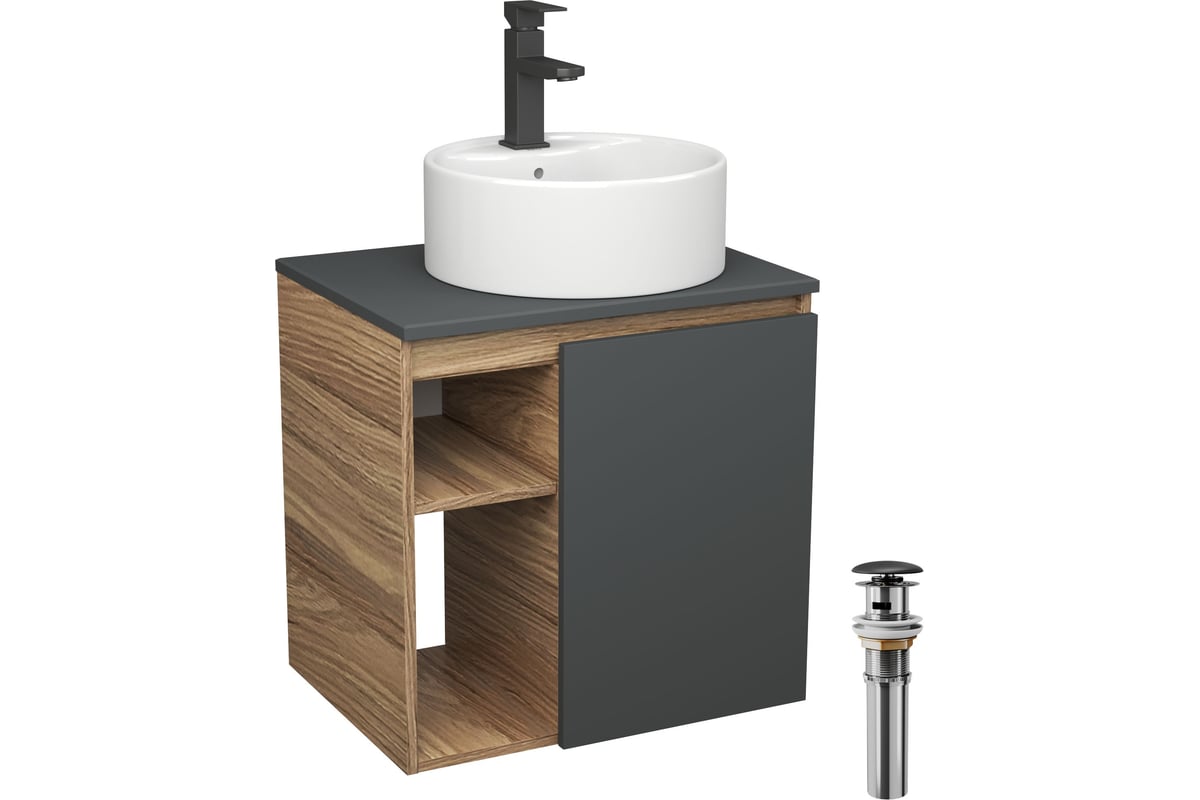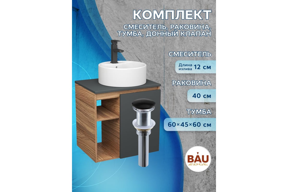 Тумба Bauedge Bau Dream Blackwood 60 правая, графит, раковина BAU Element D40, белая, смеситель Hotel Black, черный, выпуск клик клак черный SD4307