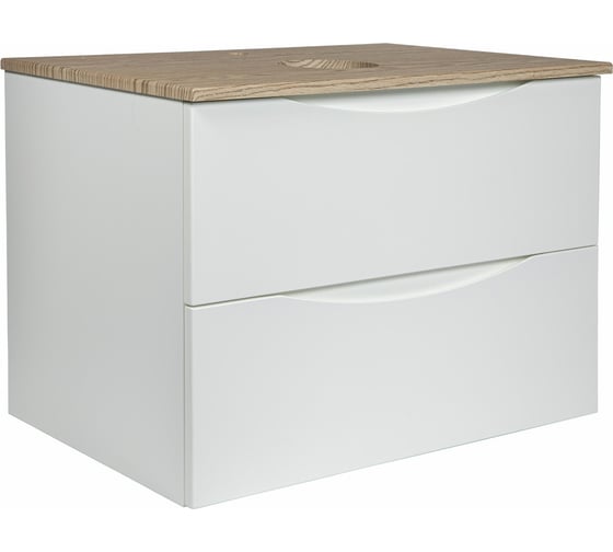Тумба выполнена из высококачественного МДФ с интегрированными ручками и покрыта премиальной эмалью, что обеспечивает долговечность и устойчивость к влаге. Белый матовый цвет корпуса и фасада с фактурной столешницей под дерево придает тумбе современный и элегантный вид. Столешница тумбы изготовлена из МДФ и покрыта премиальной фактурной пленкой Ceramic Pro (цвет - дуб тангент натуральный софт) обеспечивающей прочность и устойчивость к царапинам.