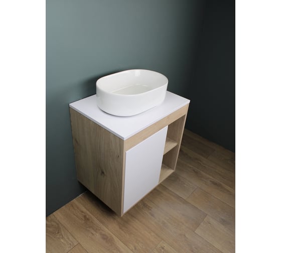 Тумба подвесная с раковиной для ванной Teymi Nura, 60 см, корпус дуб, фасад белый, раковина Iva 46 F03450 ЦБ-00285308