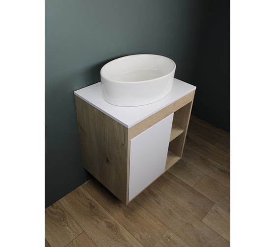 Тумба подвесная с раковиной для ванной Teymi Nura, 60 см, корпус дуб, фасад белый, раковина Lori 50 F03433 ЦБ-00285301