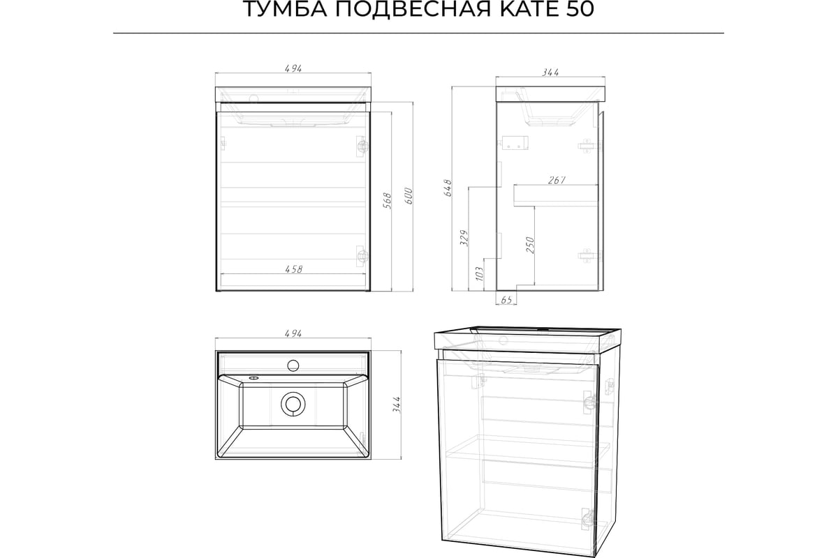 Тумба с раковиной подвесная распашная ИТАНА Kate 50 494x344x648 Токио 4657810336445