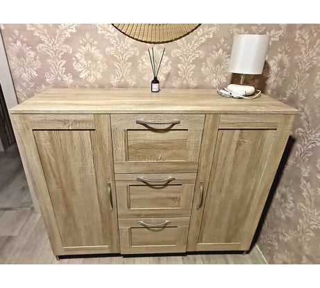 Доставка курьером, предварительно позвонил, вежливый хороший парень, сам занес в квартиру. Добротный комод, хорошего качества, собрали быстро, комплектация вся при сборки в норме.