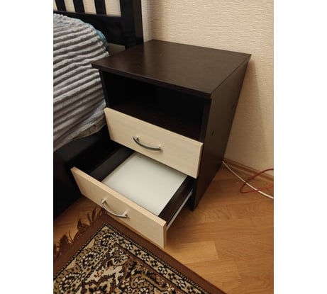Практически один в один подошла по цвету к шкафу и другой тумбе в спальне. 2 выдвижных ящика и открытая полка - для меня оптимальная функциональность.