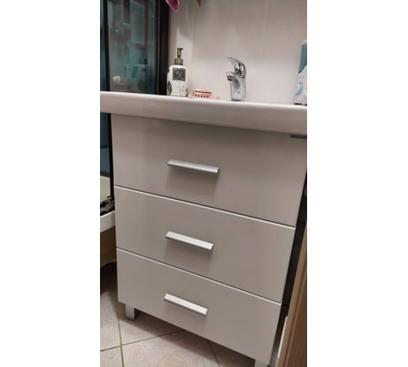 Начну с того, что я искал тумбу 60 см именно с тремя ящиками, которая стоит на полу, а не подвешивается на стене. По этим критериям, она мне полностью подошла. так же она мне подошла по габаритным размерам, я ставил умывальник не Фостер, а Cersanit. Выполнена из влагостойкой ДСП. Теперь о недостатках: Нижние кромки ящиков не облицованы кромочной лентой, оставлен голый торец ДСП, пришлось дооблицовывать. Дно ящика с одной стороны держится в пазу (как и должно быть) а с другой прибито к кромке ДСП скобами, которые работают "на отрыв" как и в случае с гвоздями такое соединение недопустимо. (нужны хотя бы саморезы) Направляющие ящиков прикручены к боковинам всего на 2 самореза на сторону, по опыту использования подобных направляющих это приводит к их быстрому раскручиванию и выпадению. ДВП использованное для изготовления дна ящика крайне низкого качества, несколько капель воды приводит к его немедленному набуханию т потере внешнего вида. В целом, при устранении недостатков, тумбу можно использовать в сегменте "эконом"
