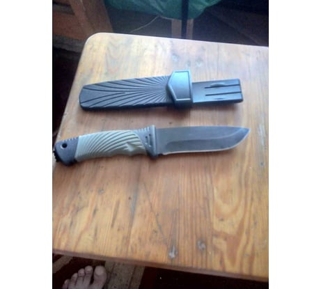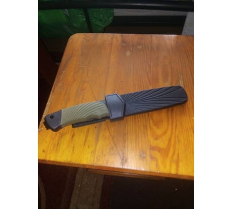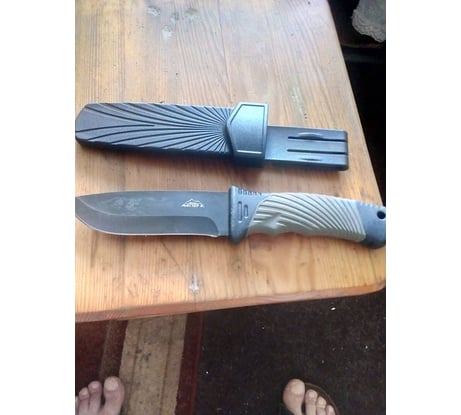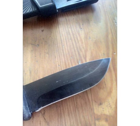 Из упаковки тупой от слова совсем! Слабое воронение, начало слезать после первого контакта с землёй. На месте где слезает воронение сразу ржавеет! Подходит только колбаску и яблочко порезать, при попытке построгать брусок,сразу пришлось точить.На ручке пластик с дефектами, при попытке убрать, начал слезать как кожа после загара. Есть в наличи ножи D2, Дамаск, 440, этот похоже из "пластилин 3", подкупили пластиковые ножны с возможностью подвеса ручкой вниз, держится намертво.