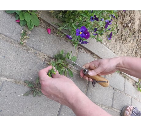 Правильная форма лезвия, которая удобна для зачистки сорняков в щелях Удобная ручка создаёт хороший рычаг для удаления корней сорняков Лезвия режут корни вдоль, что для сорняка плохо