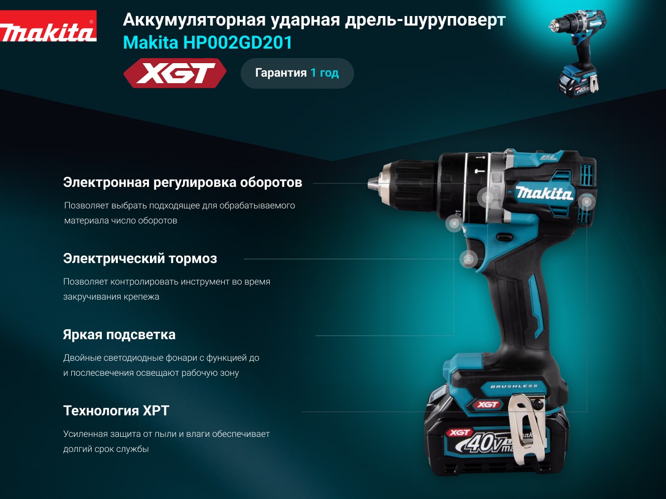 Ударная аккумуляторная дрель-шуруповерт Makita XGT BL/XPT HP002GD201 имеет 3 режима работы — сверление, сверление с ударом и заворачивание. Пригодится на стройплощадке и в мастерской.