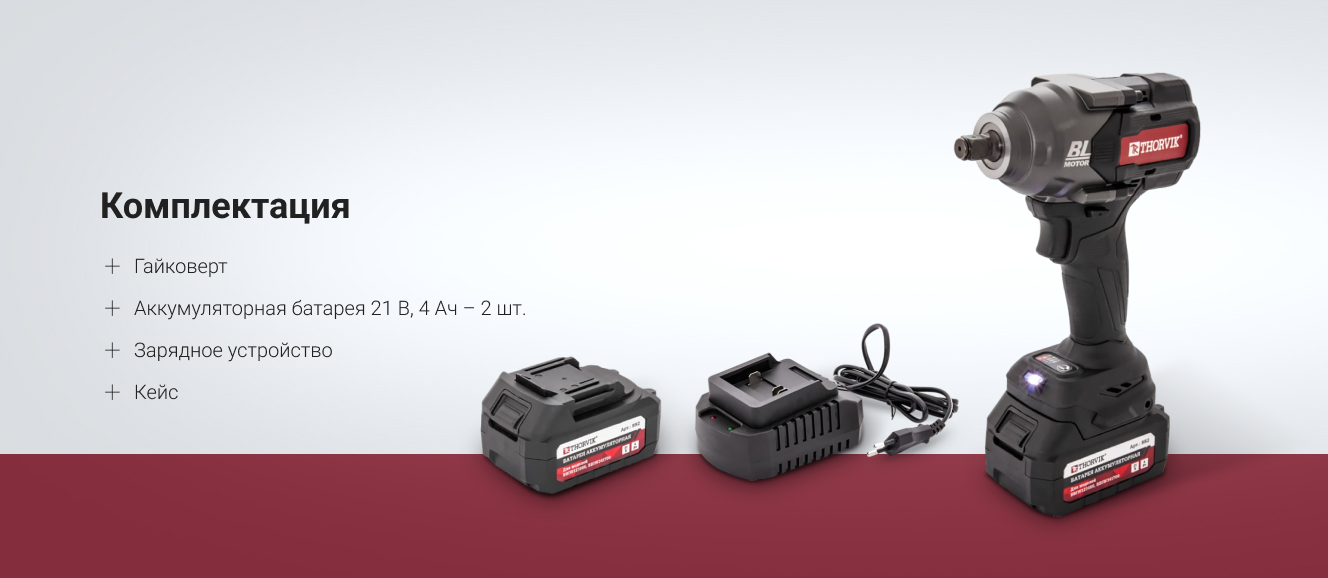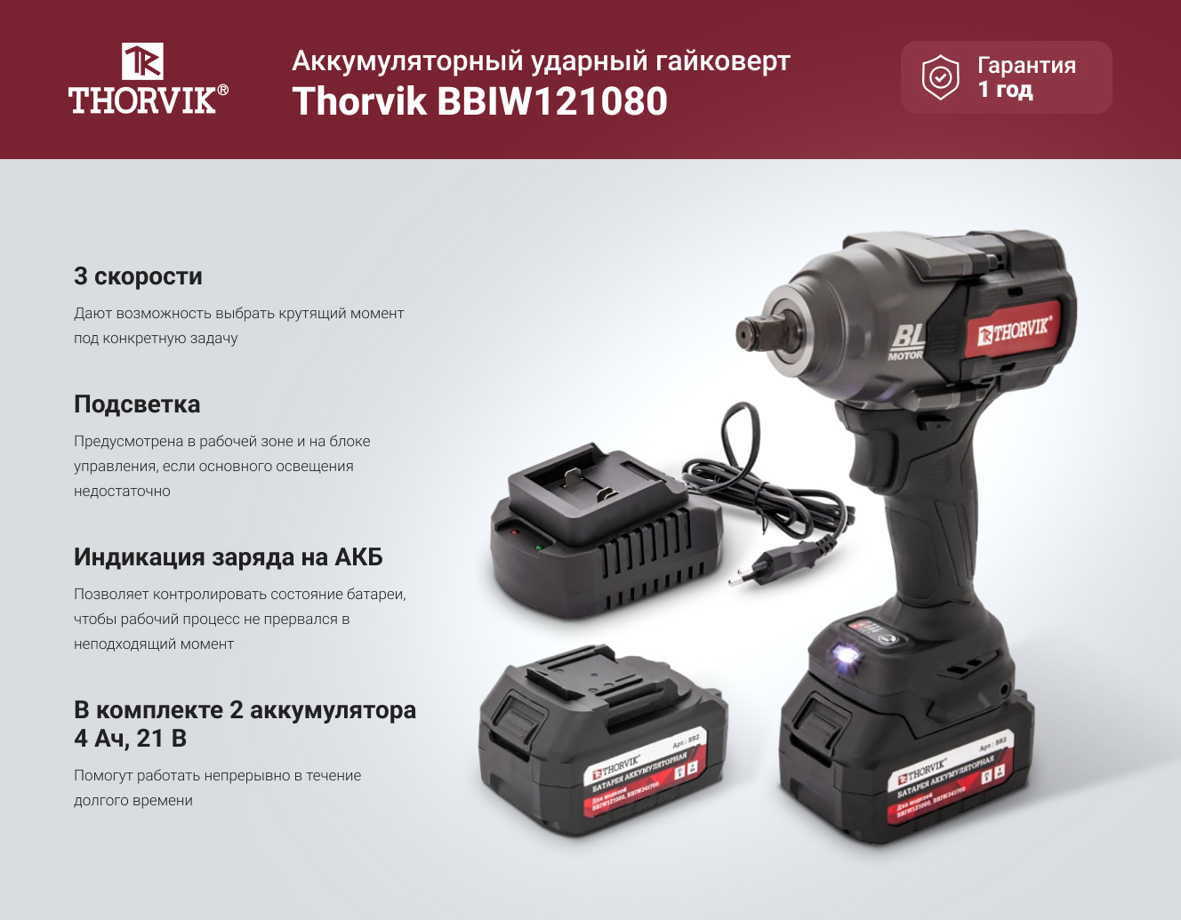 Ударный аккумуляторный бесщеточный гайковерт THORVIK BBIW121080 1/2DR, 21В, 1080 Нм 053653