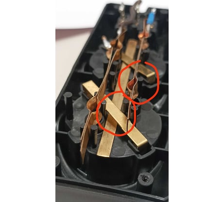 Во всех мелочах видно недобросовестное исполнение: литьё аж звенит дешевизной, таких крепежных саморезов, которыми стянут корпус, я не видел с перестроечных времён), пайка выполнена вручную неквалифицированным персоналом, металл из которого выполнены шины внутри тройника - очень мягкие, после вставки евровилки обычная вилка СССР болтается . Все вышеназванные недостатки - это сугубо мое личное мнение, с которым можно поспорить, но следущий недостаток - это факт, подтверждающий наплевательское отношение производителя к качеству изготовления: не принято никаких мер для надёжного контакта зазамляющей шины с выходной "рогаткой" зазамления - они просто лежат друг на друге. Такое соединение категорически недопустимо.