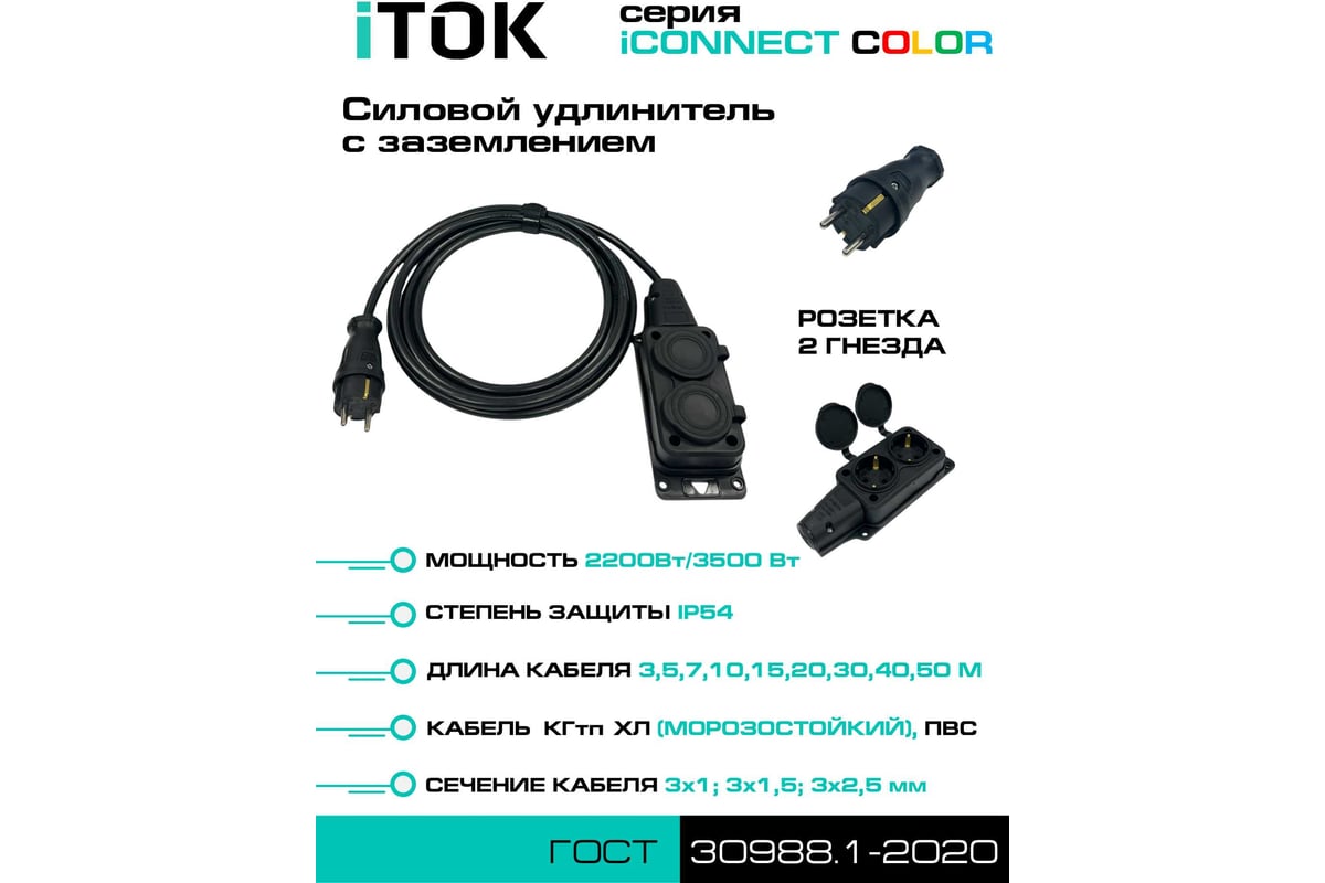 Удлинитель силовой iTOK тип SU, серии iCONNECT COLOR, с заземлением, ПВС, 3x1 мм, 2 гнезда, IP54, ГОСТ, цвет черный, 5 м i-CONNECT-COLOR-SU-PVS-310-2-54-5-BLACK