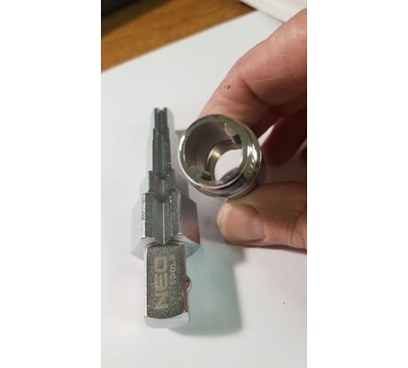 несимметричное расположение упоров для заворачивания (со стороны наружной резьбы): длины насадки 02-060 для разъемных соединений 1/2" NEO Tools ступенчатого радиаторного ключа не хватает, чтобы ввернуть удлинитель во внутреннюю резьбу .Более распространенный 6-тигранник 12 мм, на подобных удлинителях, более длинный, поэтому позволяет завернуть с любой стороны скрытно.