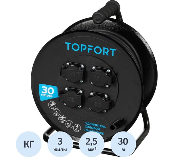 Удлинитель TOPFORT КГ 3х2,5 30м, на металлической катушке, с заземлением, с заглушками, IP44 2267268