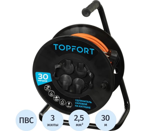 Удлинитель TOPFORT ПВС 3х2,5кв.мм, 30м на пластиковой катушке, 4 розетки с заземлением, IP44 2267261