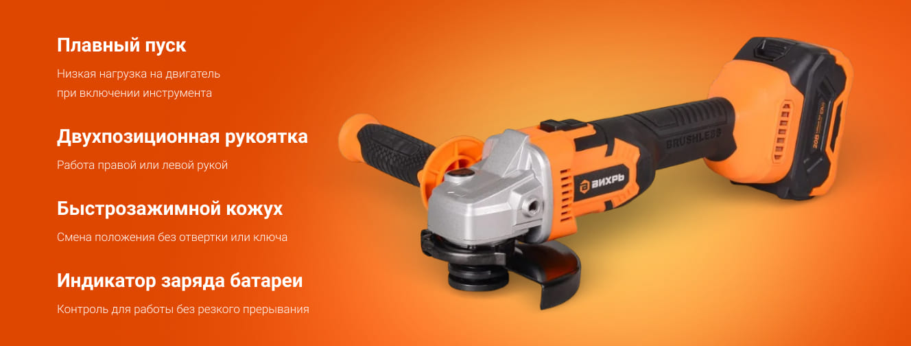 Аккумуляторная угловая шлифовальная машина АУШМ-125/20Li Вихрь - ручной электроинструмент, предназначенный для выполнения шлифовальных и отрезных работ по металлу и иным конструкционным и строительным материалам (кроме асбестосодержащих), без подачи воды, в производственных и бытовых условиях, с помощью шлифовального/отрезного круга. Источником питания служит литий-ионный аккумулятор.