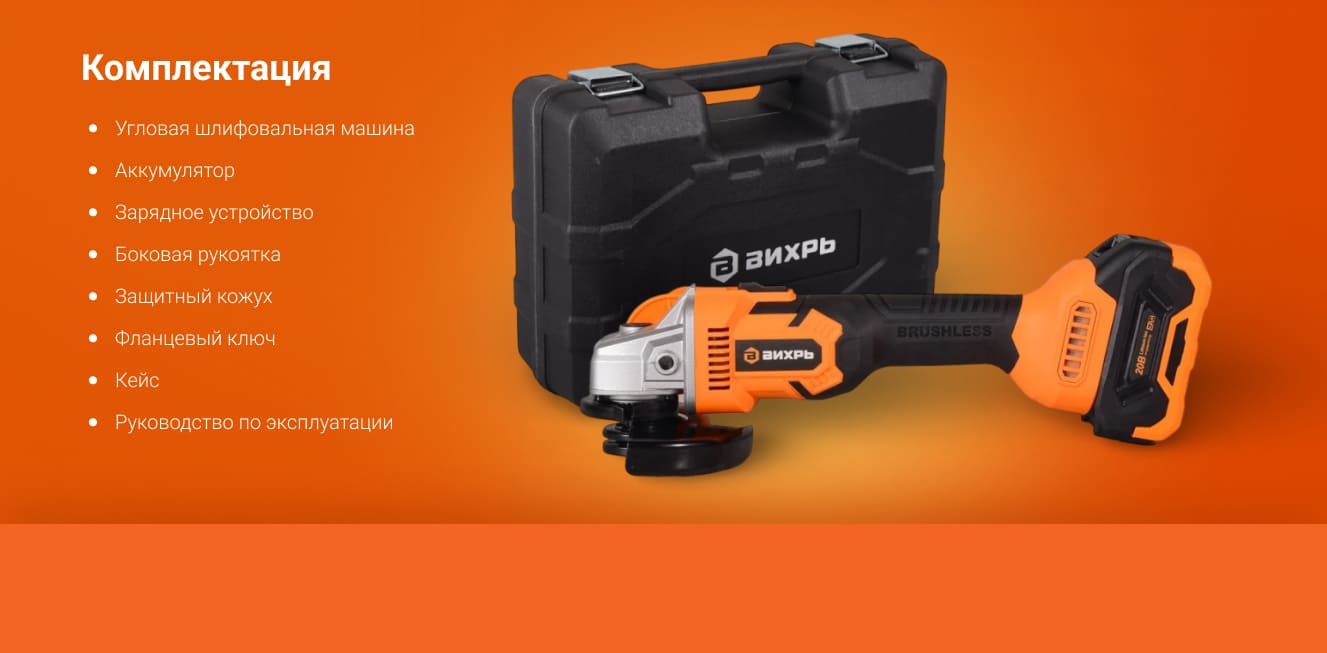 Углошлифовальная машина аккумуляторная Вихрь АУШМ-125/20Li, в комплекте 1 АКБ и ЗУ, в кейсе 72/12/25