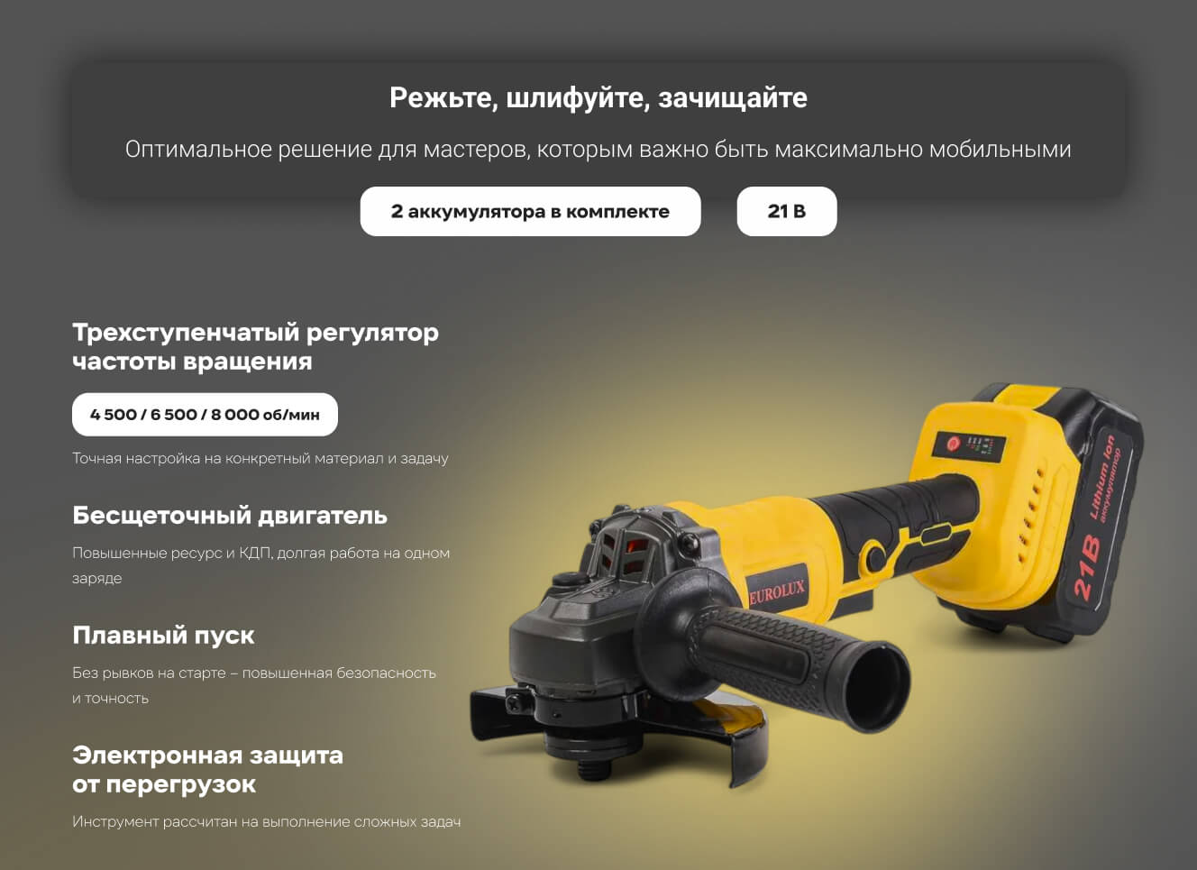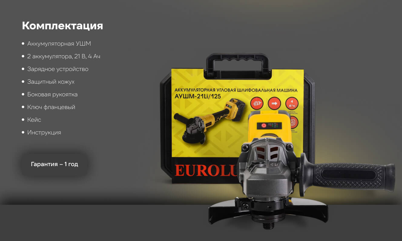 Углошлифовальная машина аккумуляторная Eurolux АУШМ-21Li/125 (в комплекте 2 АКБ и ЗУ) в кейсе 72/12/49
