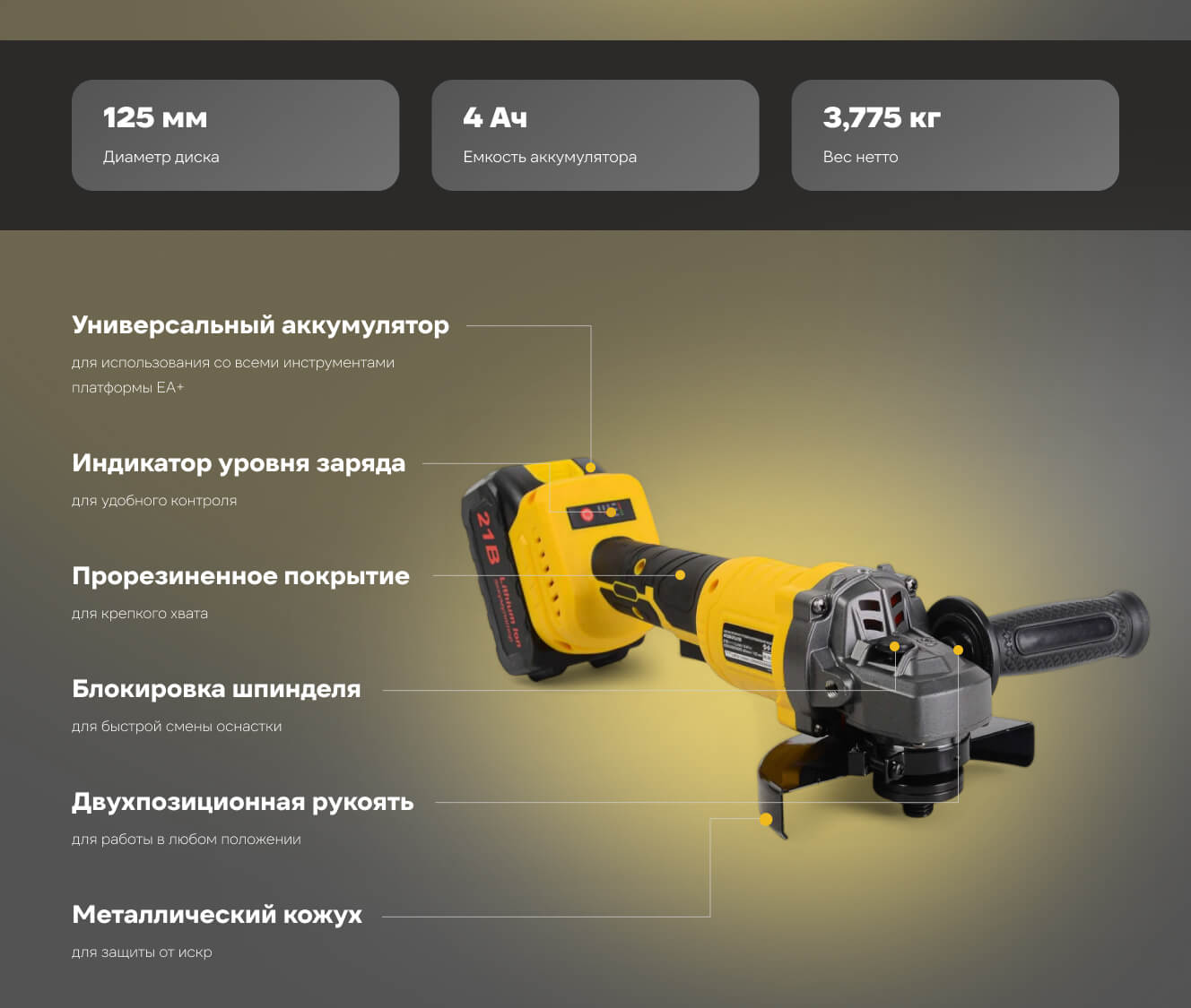 Инструмент функционирует от литий-ионного аккумуляторного блока напряжением 21 В и емкостью 4 Ач, что обеспечивает продолжительное время работы без привязки к стационарной сети электропитания.