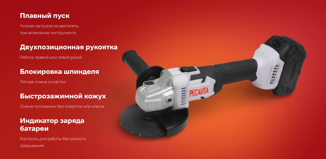 Аккумуляторная угловая шлифовальная машинаАУШМ-125/20Li Ресанта - ручной электроинструмент, предназначенный для выполнения шлифовальных и отрезных работ по металлу и иным конструкционным и строительным материалам (кроме асбестосодержащих), без подачи воды, в производственных и бытовых условиях, с помощью шлифовального/отрезного круга. Источником питания служит литий-ионный аккумулятор.