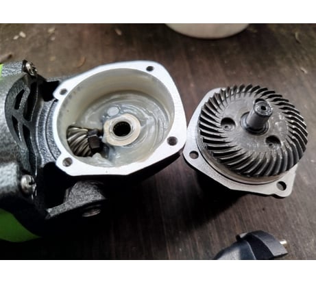 Из плюсов: кабель резиновый с липучкой для удобства хранения видимо, электросхема залита, радиаторы элементов мощные, обороты набирает плавно, без рывка(плавный пуск), редуктор полностью забит смазкой, крепление симметричное, можно крутить для левшей, правшей, для шлифовки, подшипник ведомой шестерни.
