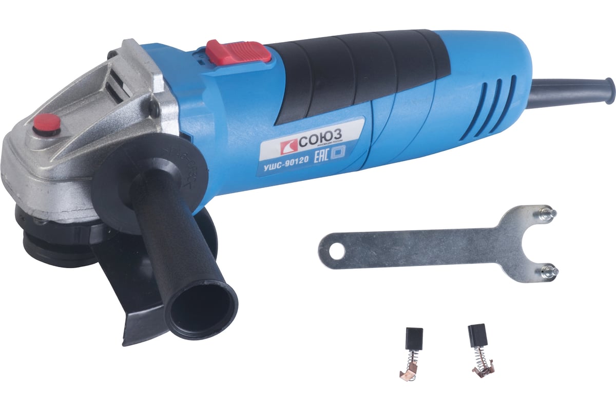 - Обрезиненная рукоятка - для надежного удержания углошлифовальной машины СОЮЗ УШС-90120;