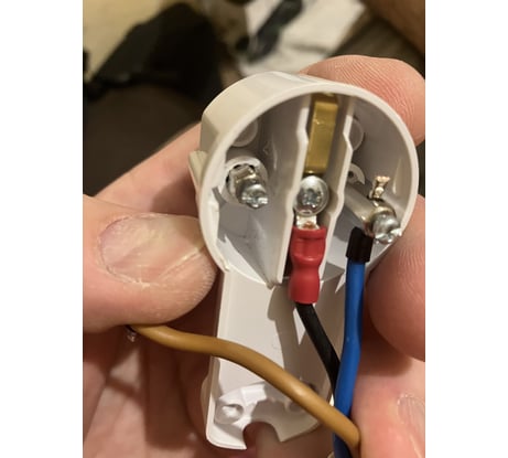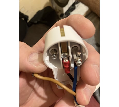 Один контакт вылетает из вилки, второй повернут так что провод в наконечнике не вставить. Сама конструкция ненадежная и опасная, рано или поздно саморезы вырвет из корпуса и в розетке останется торчать часть с оголенными проводами.