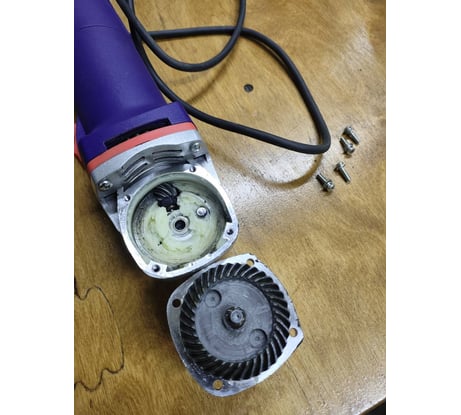 Это моя пятая по счету маленькая болгарка, и первая с "полным фаршем" - регулировка оборотов, поддержание оборотов и виброручка. По внутреннему исполнению данная болгарка выгодно отличается от прочих дешевых. Редуктор хорошо набит смазкой, и не простым литолом. Впервые увидел шарикоподшипник на заднем конце оси диска, ранее встречал только бронзовые втулки (в дешевых УШМ) либо игольчатый подшипник (в большой УШМ). Приятно удивила (пыле)защитная крышка на месте выхода оси диска из редуктора, как и план-шайба с резиновым колечком. В описании указана допустимость работы по бетону, а вот тут вопросы к производителю - обмотки покрыты лаком (хотя и добротно), но вот бронировки нет. Как нет и лабиринтного уплотнения у заднего подшипника якоря. Как долго болга