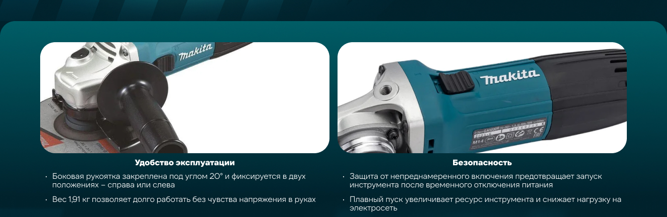 Значит так. Плавный пуск есть, защита от случайного включения есть, производитель Китай, но в сравнении с Румынией внешне и по звуку работы одинаковые. В комплекте дополнительно к металическому кожуху 125 идёт ещё и пластиковый для улавливания искр 125. Так же лежит шлифовальный диск 1 штука и 5 штук дисков отрезных по металу. Ключ, гайка обычная, фланец обычный. Машинка в полном обвесе с ручкой,двумя кожухами и отрезным диском весит 2,05 кг внушительно, но при таком удобном хвате это не чувствуется. В целом я бы порекомендовал её новичкам или тем кто боится УШМ, очень она удобная и лояльней к ошибкам. Девушкам тоже будет удобна. Дуракам которые давят всем телом топя машинку в метале на пушечный выстрел не подходить она 720W вы же умудряйтесь и 2600W спалить. У меня раньше была Black and Decker на 800W лет 15 отработала и редуктор рассыпался от усталости метала, звёздочки на куски развалились. Так она намного толще была и при включении срывалась с места, шайтан машина! Очково ей работать было) А Макита в целом деликатней по скорости и чёткости не уступает а делает всё так же прекрасно. Короче пока цена 6100₽ берите, она того стоит.