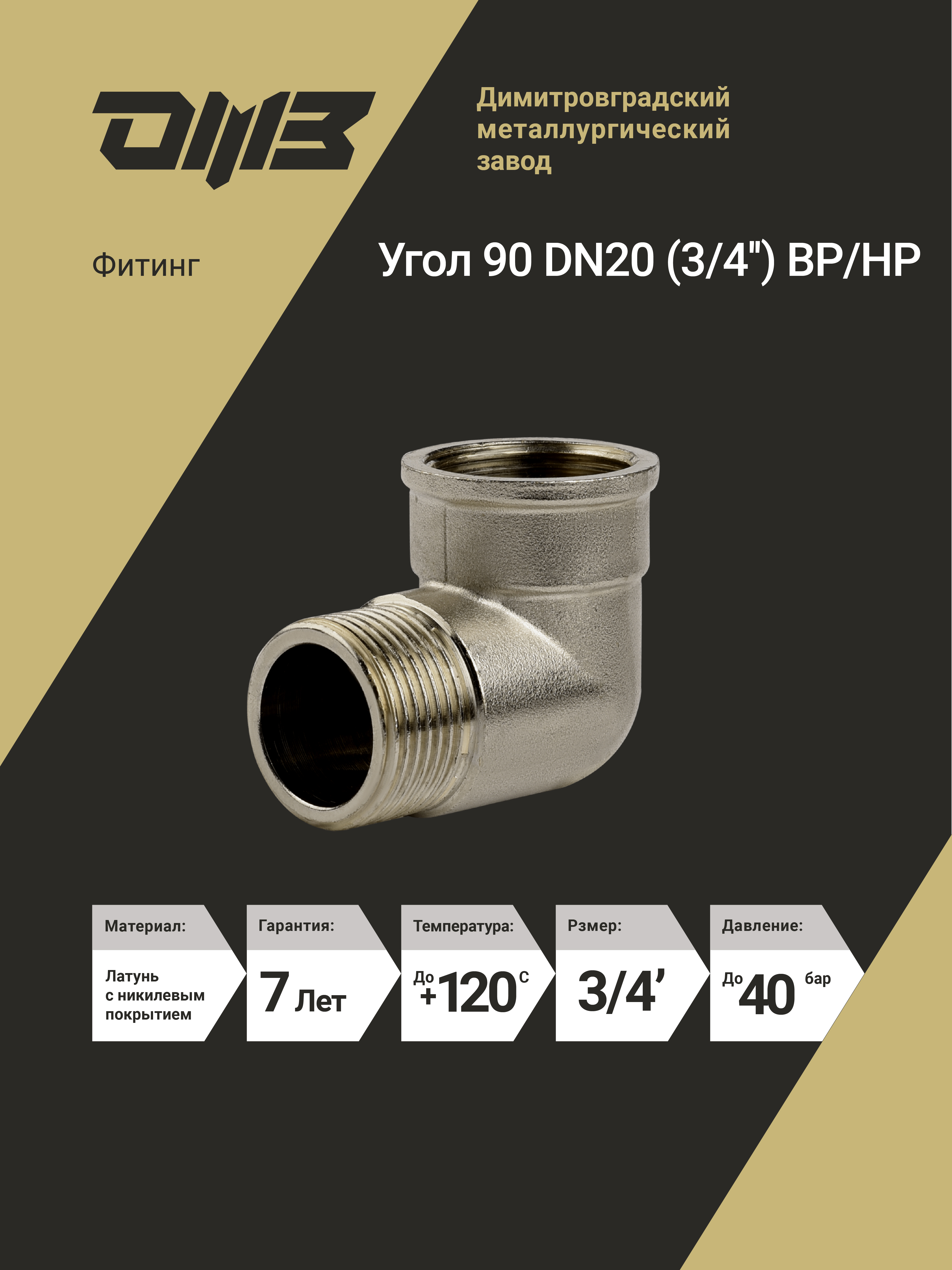 Угол ДМЗ 90 DN20 (3/4'') ВР/НР латунь никель, 3 шт ДМЗ.011.20Н3