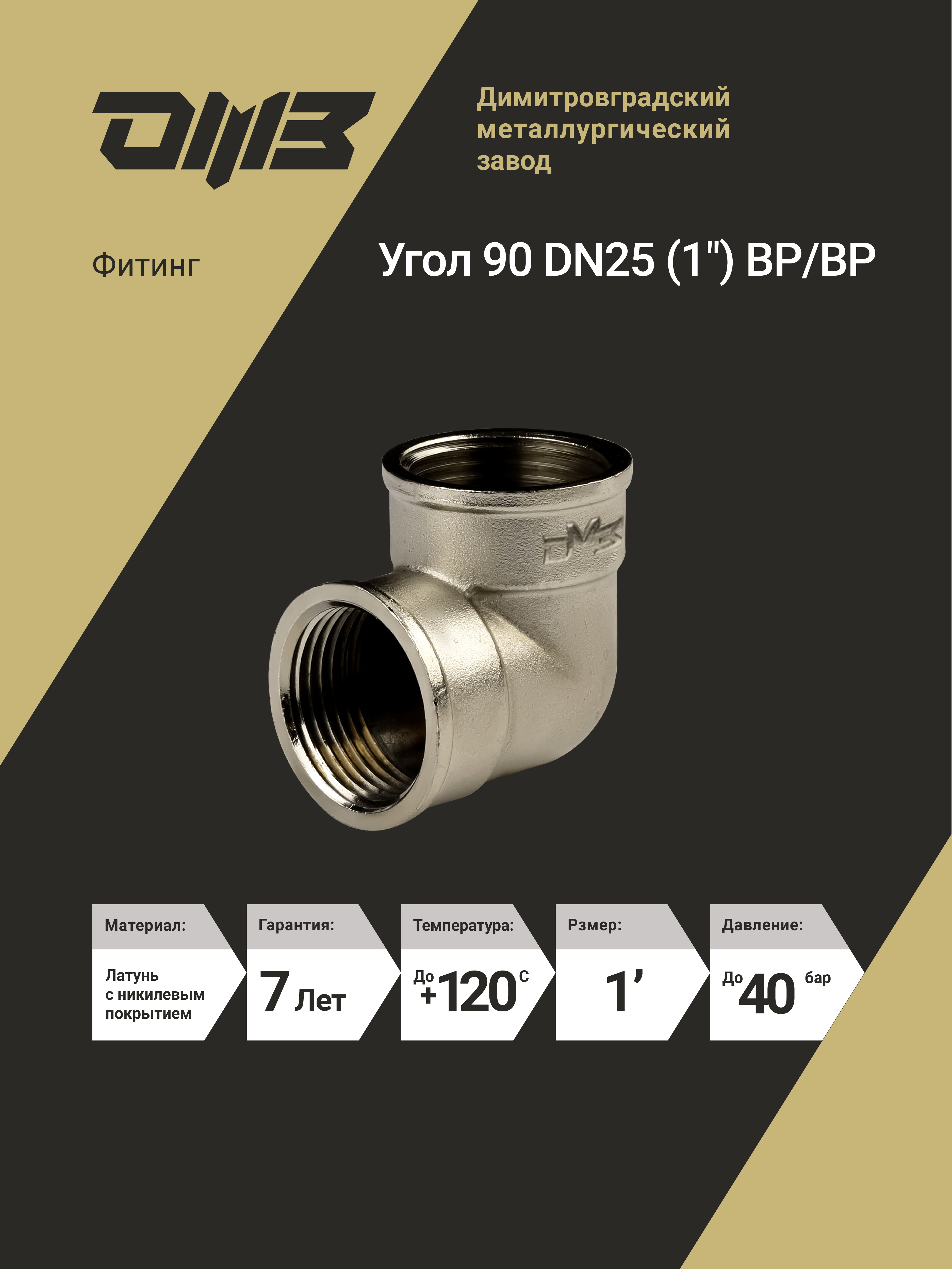 Угол ДМЗ 90 DN25 (1") ВР/ВР латунь никель, 2 шт ДМЗ.008.25Н2