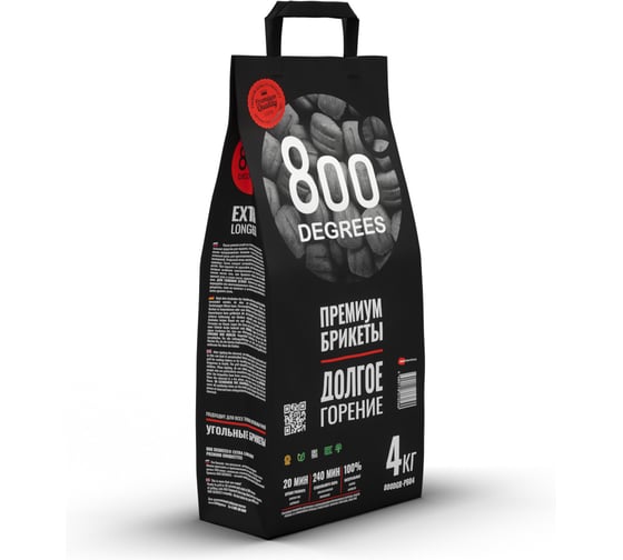 Уголь в брикетах 800 Degrees Premium Долгое Горение, мешок 4 кг 800DGR-PB04