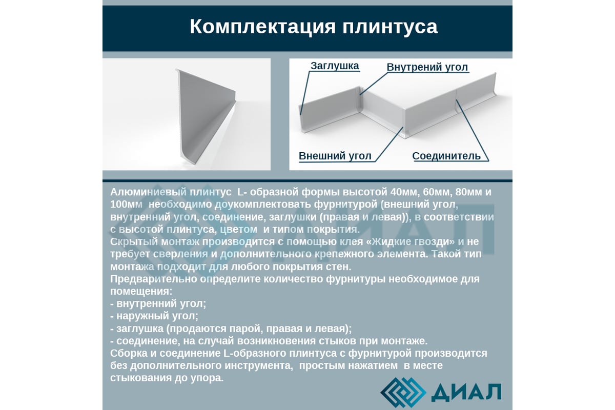 Внутренний угол для плинтуса - это фурнитура для монтажа, предназначенная для соединения внутренних углов L- образного алюминиевого плинтуса. Монтаж проводится без применения дополнительных инструментов и средств, внешний угол плотно и надежно фиксируется при небольшом надавливании.