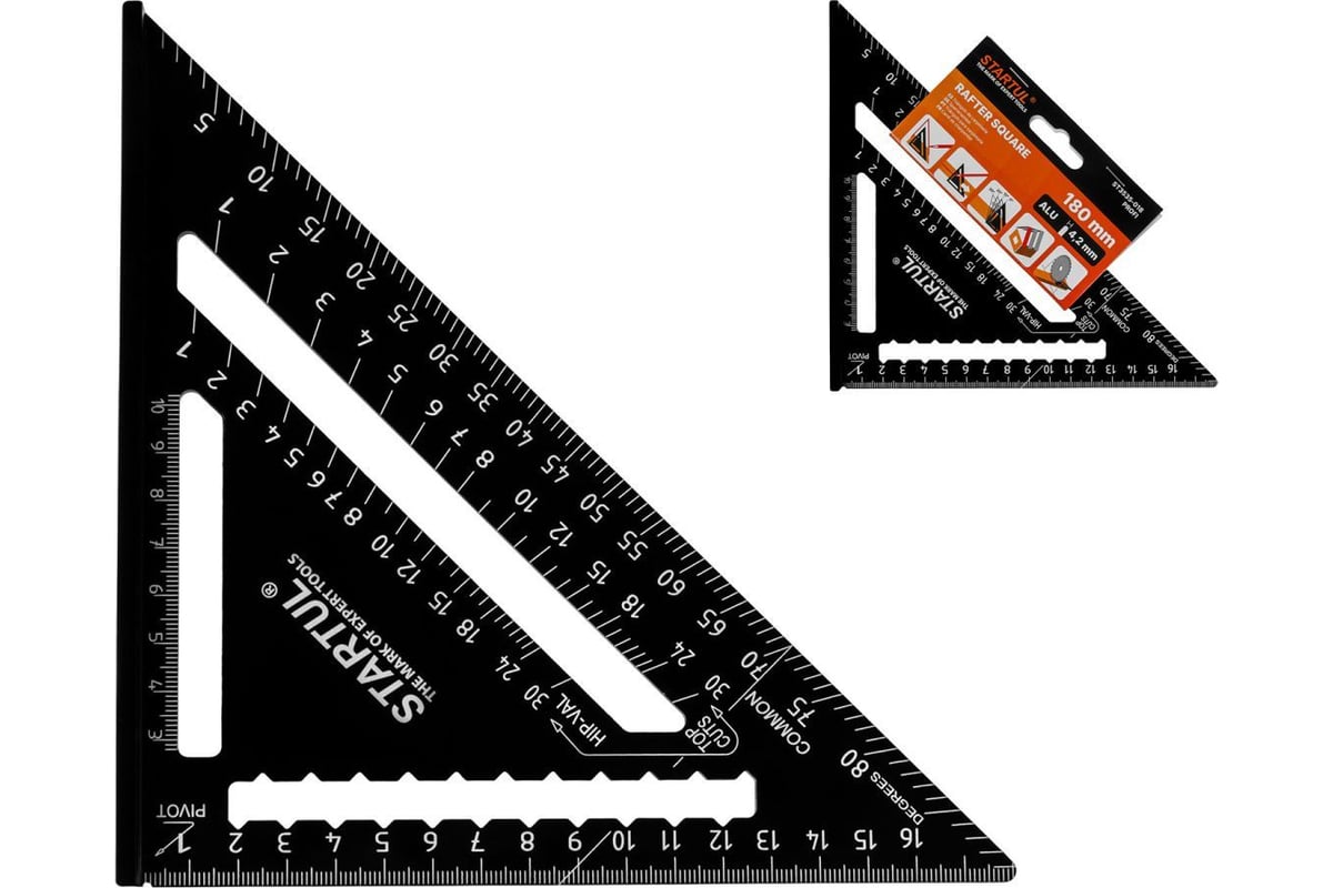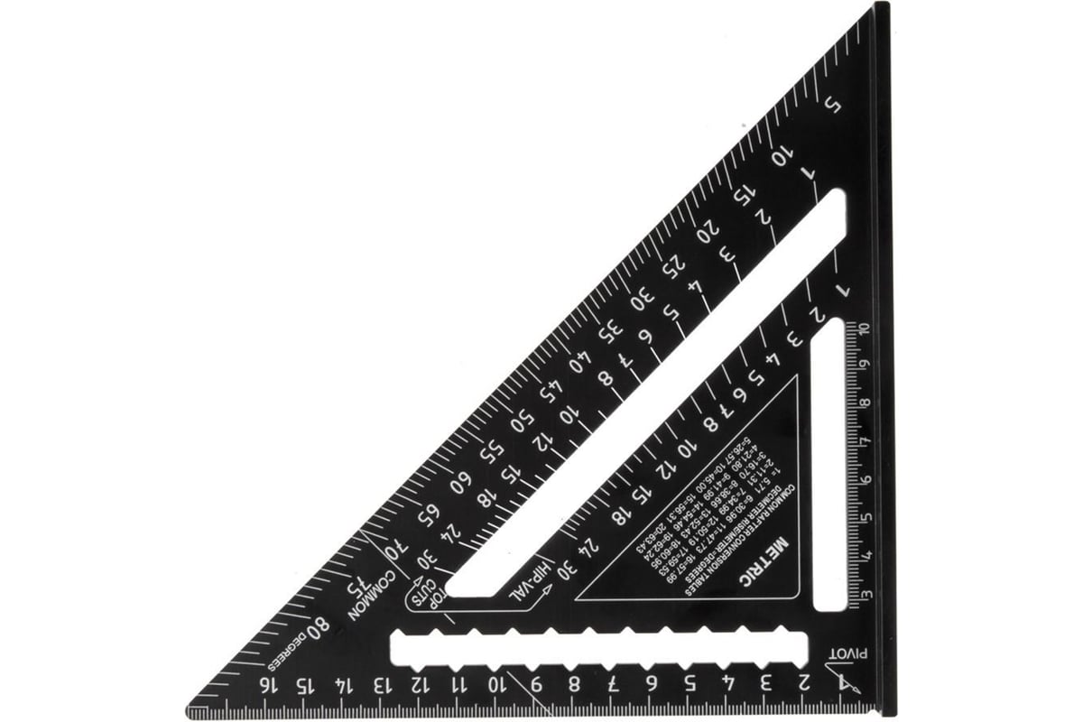 Угольник Свенсона (кровельный) предназначен для разметки коньков и стропил, удобен для откладывания прямых линий, параллельных или перпендикулярных основным направлениям детали. Изготовлен из алюминия. Шкала нанесена с помощью лазерной гравировки. Толщина профиля 4,2 мм.