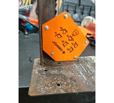 Достаточно сильный магнит, ровно держит заготовку, удобно при сварке.