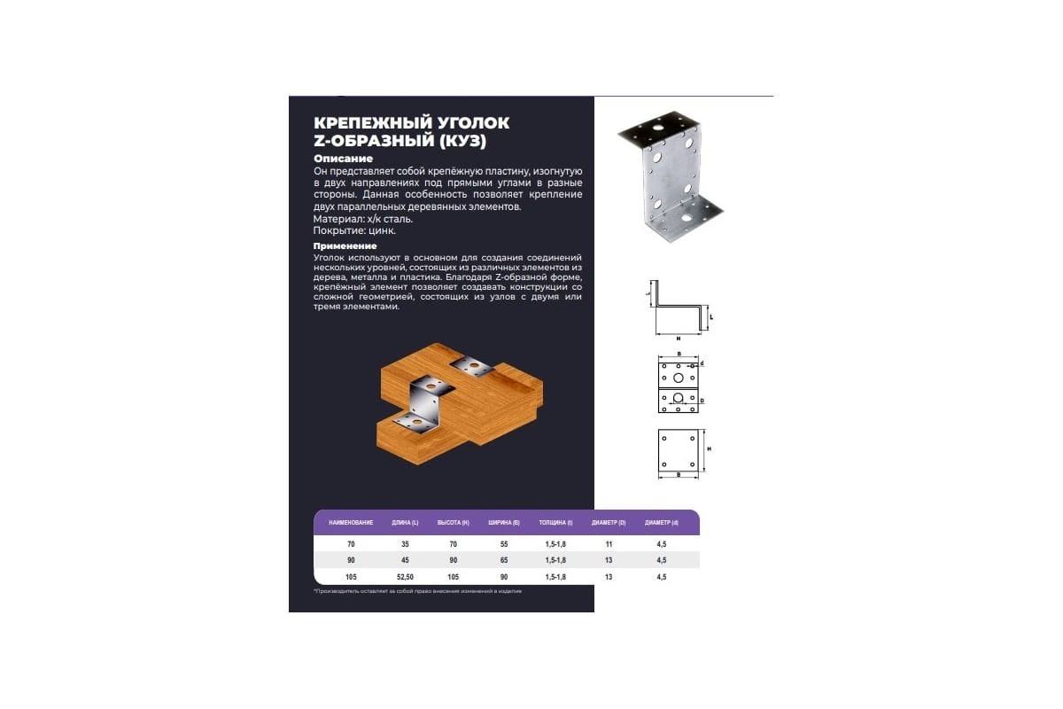 Уголок крепежный Z-образный - это металлическая соединительная пластина с перфорацией, изогнутого типа. Может использоваться для крепления балок, опор, вспомогательных и несущих элементов в стропильно-подстропильной системе при строительстве деревянных конструкций и домов. Крепежный уголок Z-образный позволяет скрепить две несоприкасающиеся доски или пластины, зафиксировать параллельные несущие, находящиеся на разных уровнях. Применяется для повышения несущей способности смонтированной конструкции.