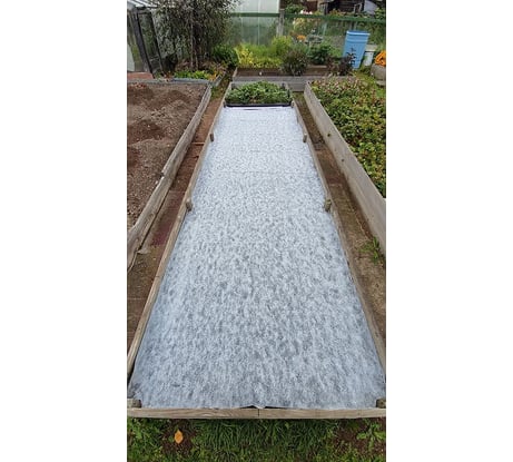 Спанбондом закрыла грядку, приготовленную под клубнику. Пересаживать уже поздно в этом году, зато весной сэкономлю время. Со спанбондом было легко работать. Закрепила садовыми скобами, делая в материале небольшие надрезы канцелярским ножом. Почти сразу заморосило, поэтому спанбонд на фото в капельках. Позже шли дожди, но материал вид не потерял. Пока всем довольна. В конце следующего сезона увижу конечный результат.