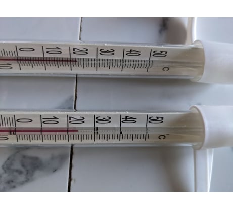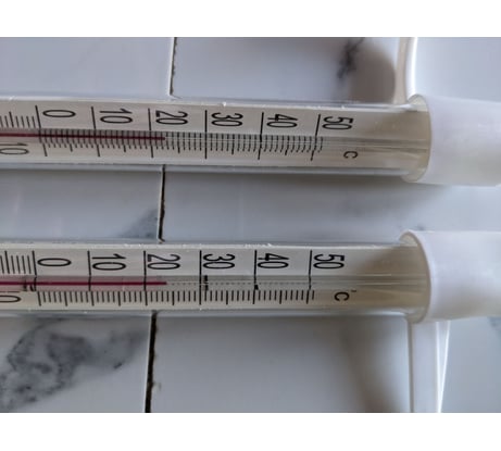 Отличный градусники. Все в пределах допуска. На крайний случай можно отградуировать ( шкала приклеина на термоклее) Если вешать на улице, то лучше защитить нижнюю часть от воды герметиком или термоклее иначе может разорвать колбу + сделать дренаж. К пластику лучше на космофен приклеить. Родной скотч не выдержит на морозах. Да и стекло проще мыть будет.