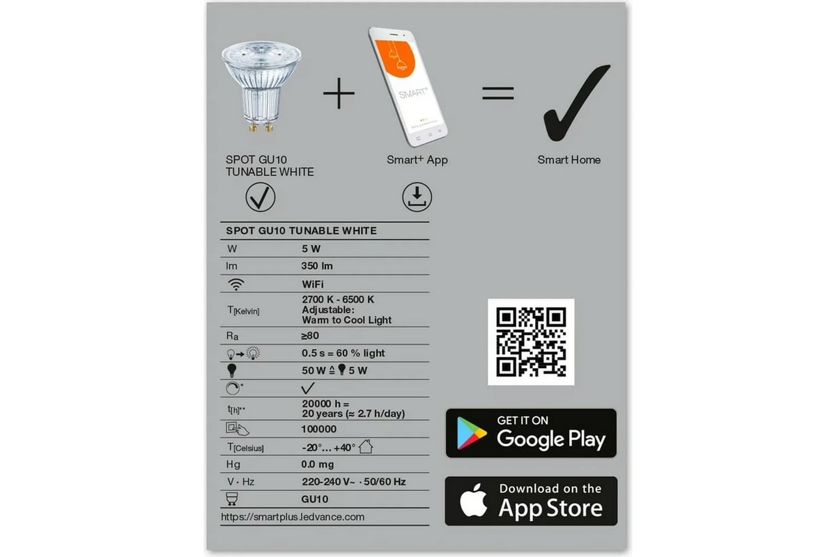 Вопросы и ответы о лампе LEDVANCE SMART+ WiFi SPOT GU10 Tunable White 40 45 5 W/2700…6500K GU10 4058075485679