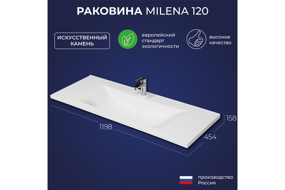 Раковина для ванной Итана Milena 120 1196x455x156 изготовлен из искусственного мрамора. Верхний слой Гелькоута образует декоративно защитное покрытие. Не содержит вредных для здоровья человека веществ, экологически безопасный. Шумопоглощающая поверхность. Имеет центральное отверстие под смесительа. Раковина может быть встроена на мебель, в столешницу и на подстолье.Изделия коллекции отлично впишутся в популярные и современные интерьерные решения для ванных комнат.
