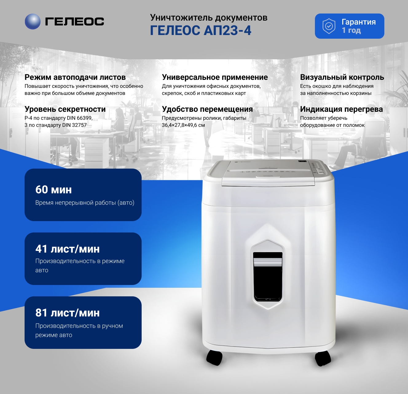 Технические характеристики уничтожителя документов ГЕЛЕОС АП23-4