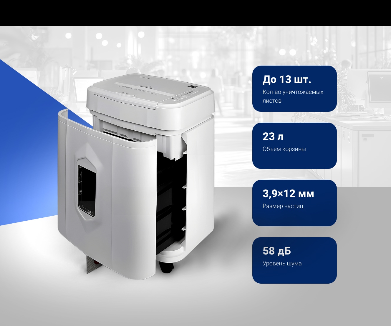 Шредер оборудован функциями реверса, автореверса, автостарта и автостопа. Дополнительно предусмотрены индикаторы перегрева, затора и открытой дверцы. Уровень шума составляет 55–58 дБ. Для удобства перемещения предусмотрены колёса. Мощность двигателя — 290 Вт. Компактные размеры позволяют разместить устройство под столом или в офисном пространстве.