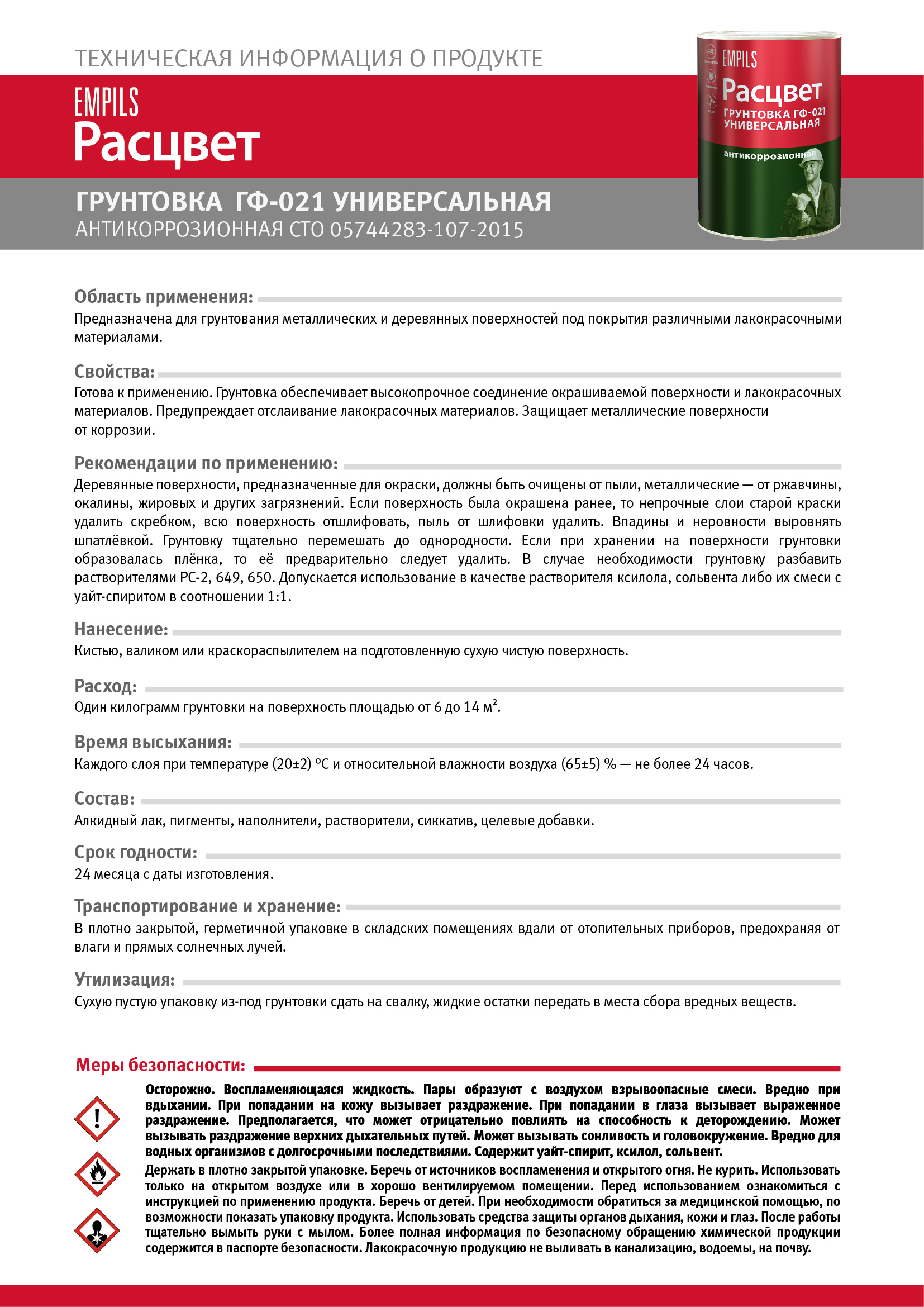 Универсальная грунтовка ГФ-021 Расцвет белая, 0.9 кг 4438 предназначена для грунтования металлических и деревянных поверхностей под покрытия различными эмалями и другими лакокрасочными материалами.