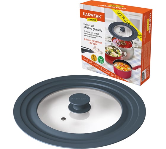 Универсальная крышка DASWERK, выполненная из силикона и стекла, позволит сэкономить не только время, но и пространство на кухне: одну крышку можно использовать для посуды разных размеров: 16 см, 18 см и 20 см в диаметре.