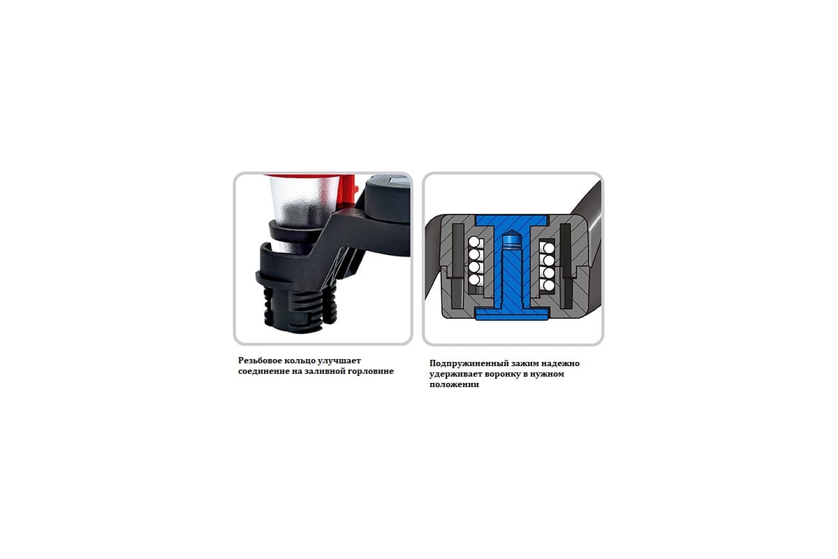 Пружинный зажим и резьбовое кольцо надежно удерживает воронку в нужном положении без помощи рук
