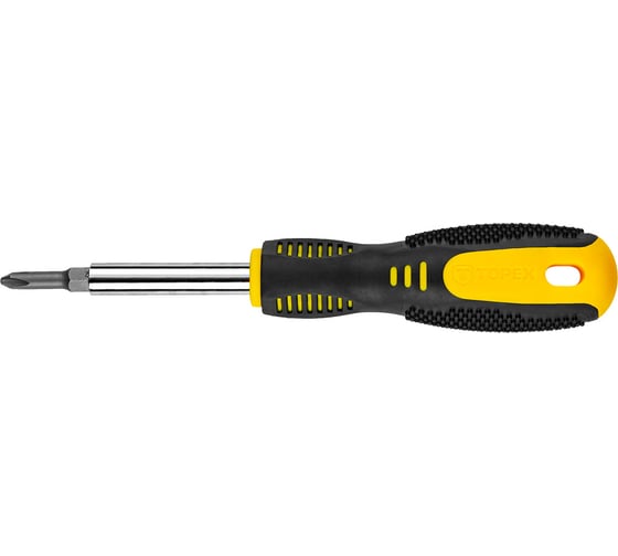 Универсальная отвертка, набор 4 шт. TOPEX 39D516 состоит из широкой пластиковой рукоятки, а также стержня и двух двухсторонних бит.