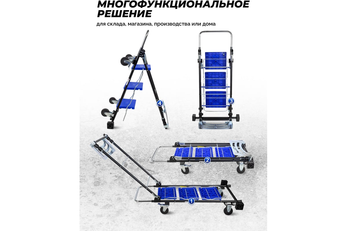 Удобное и практичное решение для перевозки грузов. Легко трансформируется в разные режимы (платформа, лестница, стремянка, тележка), что делает её незаменимой в хозяйстве, на стройке или в гараже
