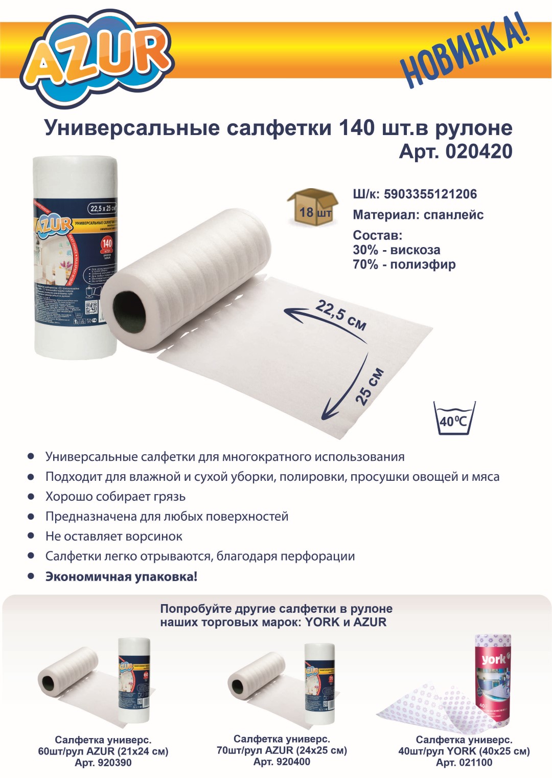 Универсальная салфетка AZUR 140 шт. в рулоне 22,5х25 020420