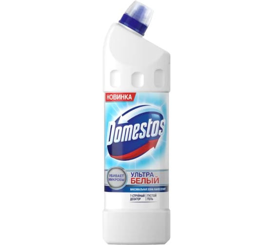 Универсальное чистящее средство DOMESTOS Ультра белый ММЛ 67319138 с инновационным семиструйным дозатором эффективно удаляет микробы и очищает унитаз даже в труднодоступных местах.