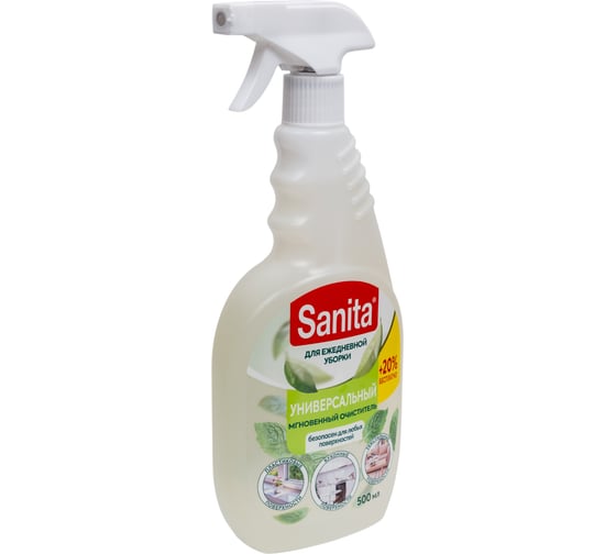 Универсальное чистящее средство-спрей для всех поверхностей и текстиля SANITA 500 мл 22719 имеет в своём составе биоразлагаемые ПАВ, которые глубоко проникают внутрь загрязнений и удаляют 100% пятен, справляются со стойкими загрязнениями и при этом безопасны для поверхностей, контактирующих с едой. Благодаря чистящей силе натуральных компонентов в составе деликатно очищает мебель, сантехнику, твердые поверхности на кухне, препятствует оседанию пыли, убирает грязь, отпечатки пальцев, следы жира, масляных пятен с текстильных поверхностей. Обладает антистатическим эффектом.