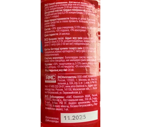 Концентрированное загущенное моющее средство с повышенным содержанием активных компонентов. Предназначено для мытья посуды, кафеля, сантехоборудования, полов и других влагостойких поверхностей. Эффективно против масложировых и застарелых комбинированных загрязнений. Универсально для мытья всех видов посуды – стеклянной, керамической, фаянсовой, хрустальной, деревянной, металлической, пластмассовой.